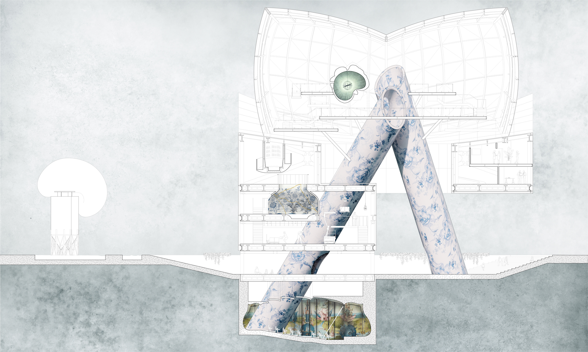 Fata Morgana (translation: Mirage) is a study in discrete parts where architectural tectonics intertwine an exquisite collection of surrealist fantasies. The common surfacing of mirrored glass obscures and distorts the part-to-whole relationship of interior elements. The outward facing effect is a building which bluntly reflects its contextual surrounding. The ‘Fata Morgana’ obscures the building in context as the reflections dissipate into the atmosphere. The interior experience withholds its mystery, inciting a sensual desire for exploration. Through glass, porcelain, and kintsugi, these discrete worlds become an object of architectural fetish.